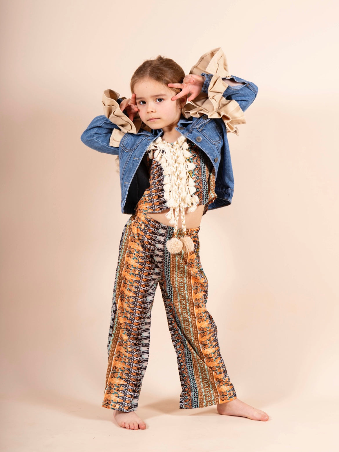 Add a touch of bohemian flair to your little one's wardrobe with our Boho Co-ord. This stylish set includes flowy trousers and a matching top with tassel details, perfect for a summer look. Available in sizes 2-12yrs.