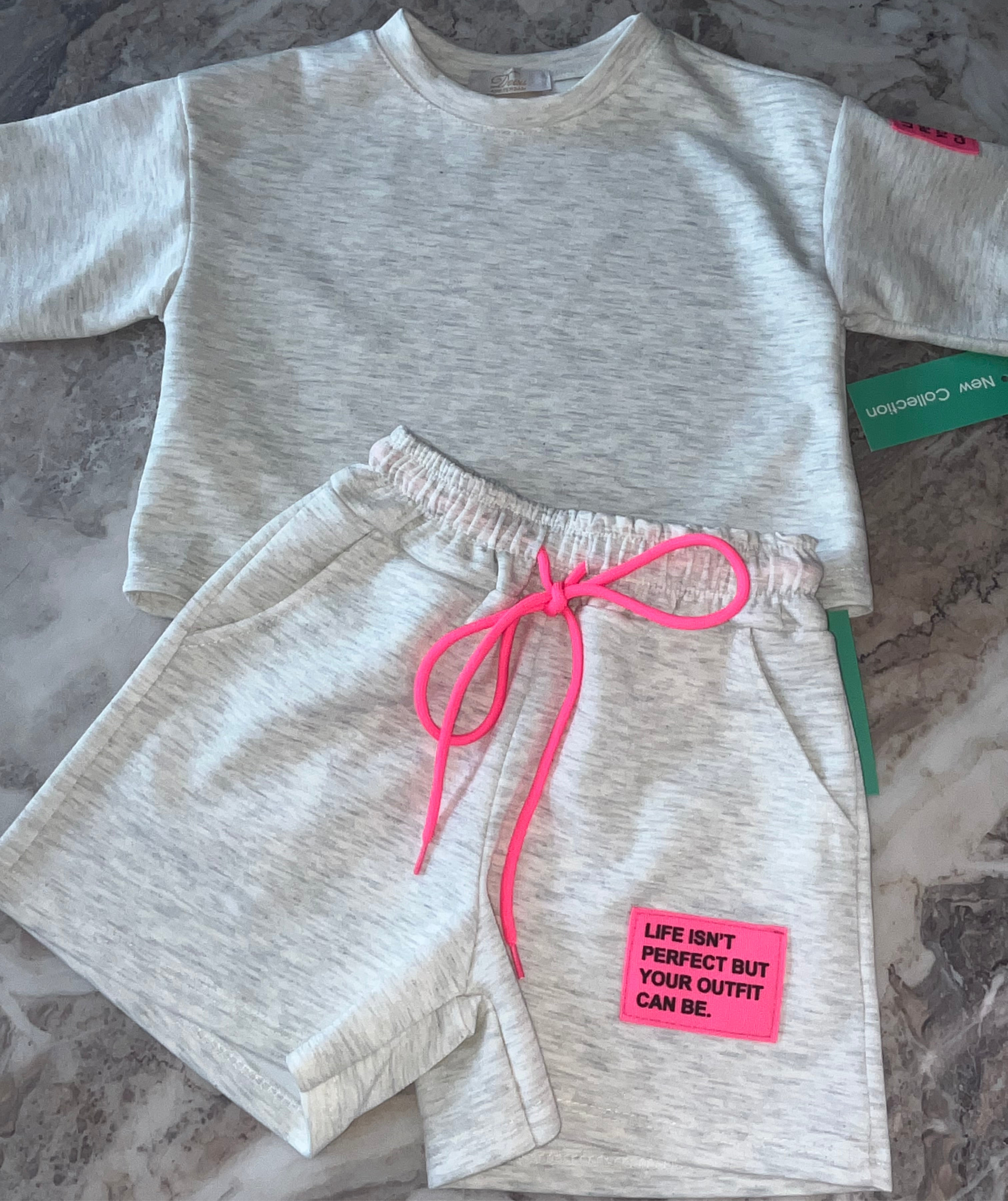 Made from super soft fabric, this TShirt & Short Set features a neon coloured contrast label and waist tie. Stay on trend this season with the fun and stylish "life ain't perfect but your outfit can be" slogan. Available for girls aged 4-14yrs.