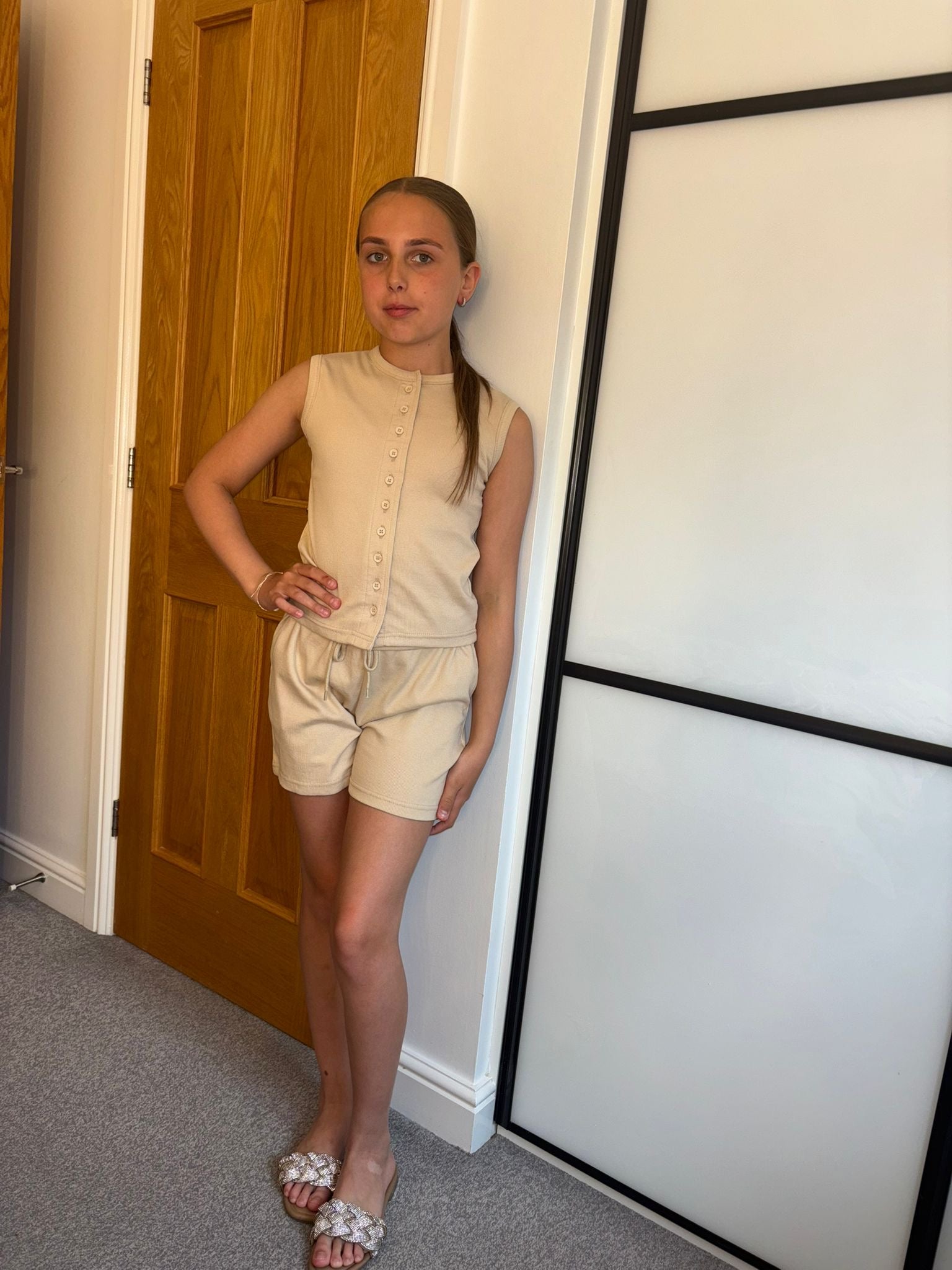 Stay stylish and comfortable this summer with our Molly Short Set. This on-trend viral set includes a sleeveless button-through top and matching shorts, perfect for girls ages 4-14. Elevate your little one's wardrobe with this must-have outfit.