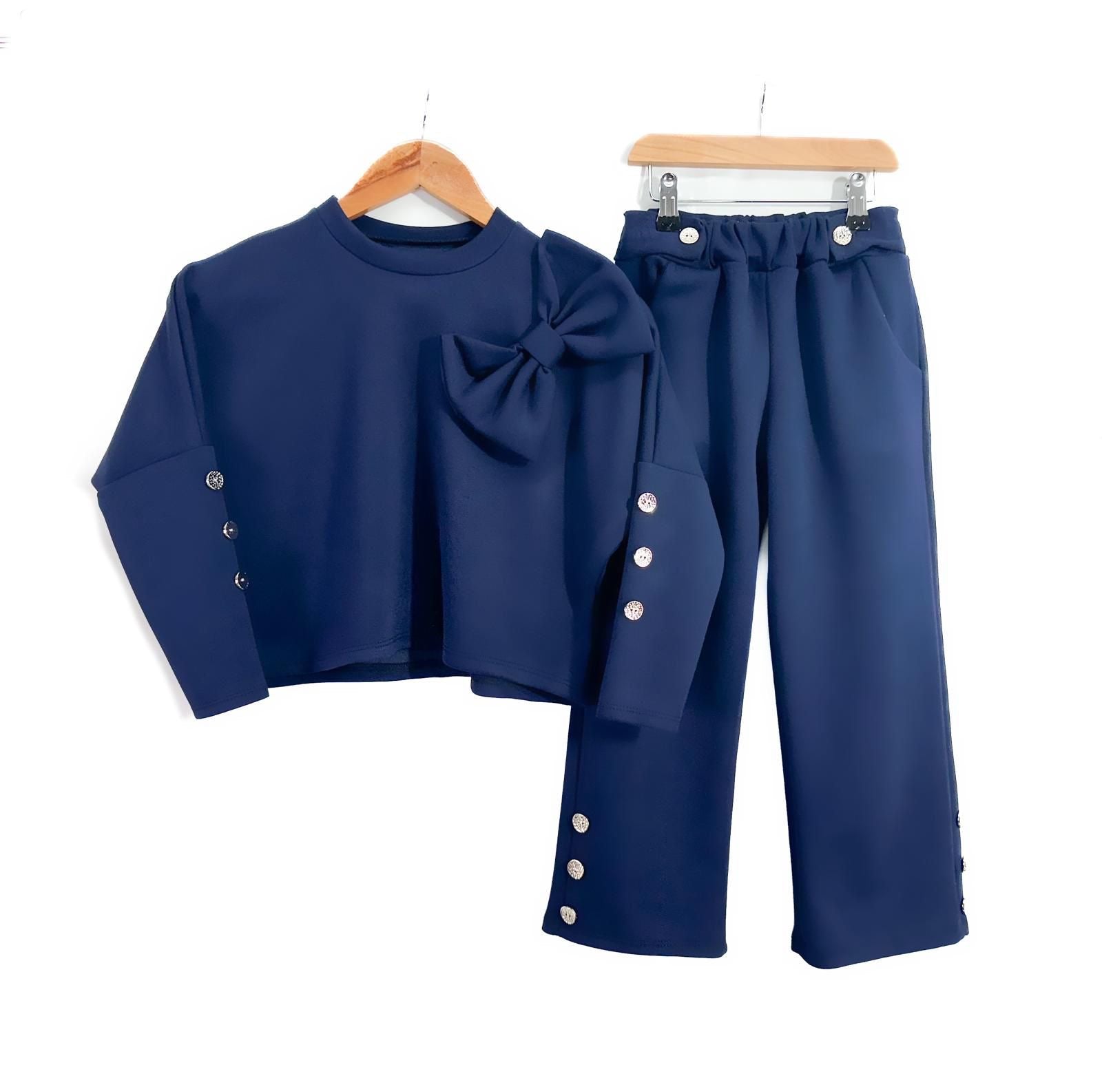 Upgrade your little girl's wardrobe with our Narla Loungeset. Classic navy blue loungeset features a large bow detail and silver buttons on the top, while the wide leg trousers add a touch of sophistication with button details. Comfortable and smart, this set is perfect for girls aged 4-14, making it a must-have for any fashion-forward child.